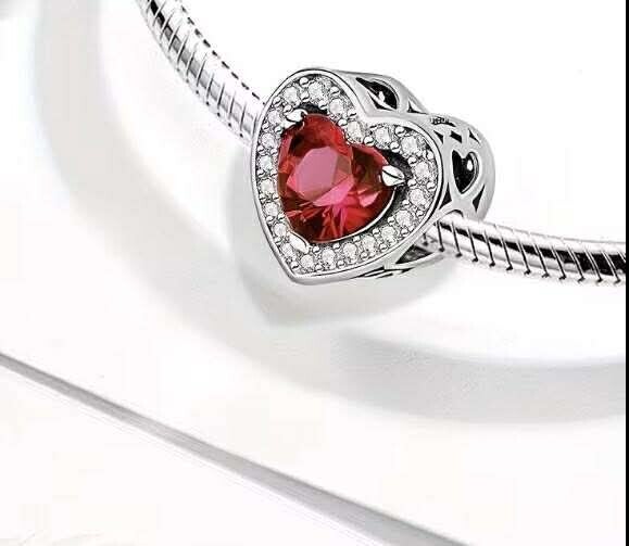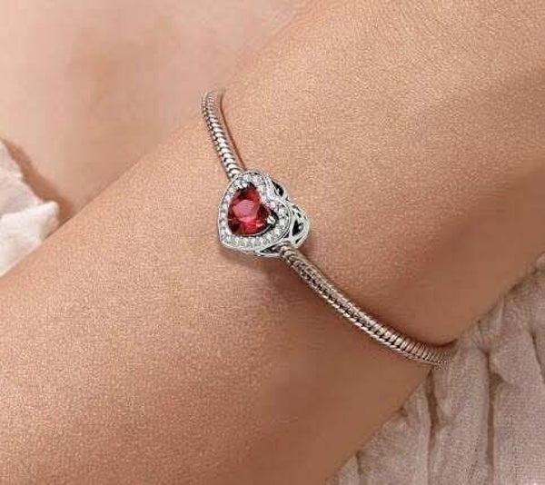 Elegant hjerteformet anheng i sølv med en dyp rød stein i midten, omkranset av glitrende klare steiner. Det romantiske designet gir et eksklusivt og tidløst uttrykk, perfekt som gave eller som et personlig smykke til hverdags og spesielle anledninger.