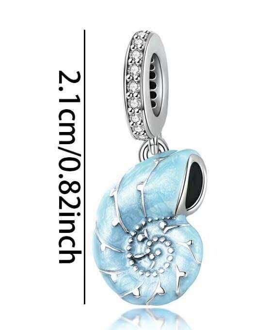 Delikat charm formet som et spiralskjell, inspirert av havets rolige og tidløse skjønnhet. Anhenget har en myk lyseblå emaljefinish med fine sølvfargede detaljer som gir et eksklusivt og feminint uttrykk. Øvre feste er dekorert med klare, glitrende steiner som tilfører et elegant preg.