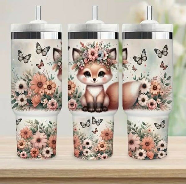 Start dagen med et smil med denne nydelige termokoppen med søt reveillustrasjon omgitt av blomster og sommerfugler. Et sjarmerende design som passer perfekt for deg som elsker dyr, natur og vakre detaljer.